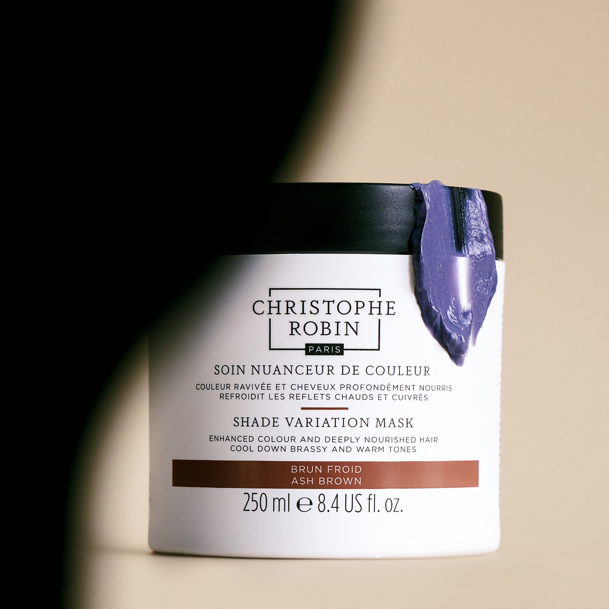 A nourishing and color-correcting mask that enhances ash tones in natural or color-treated brown hair and neutralizes brassiness