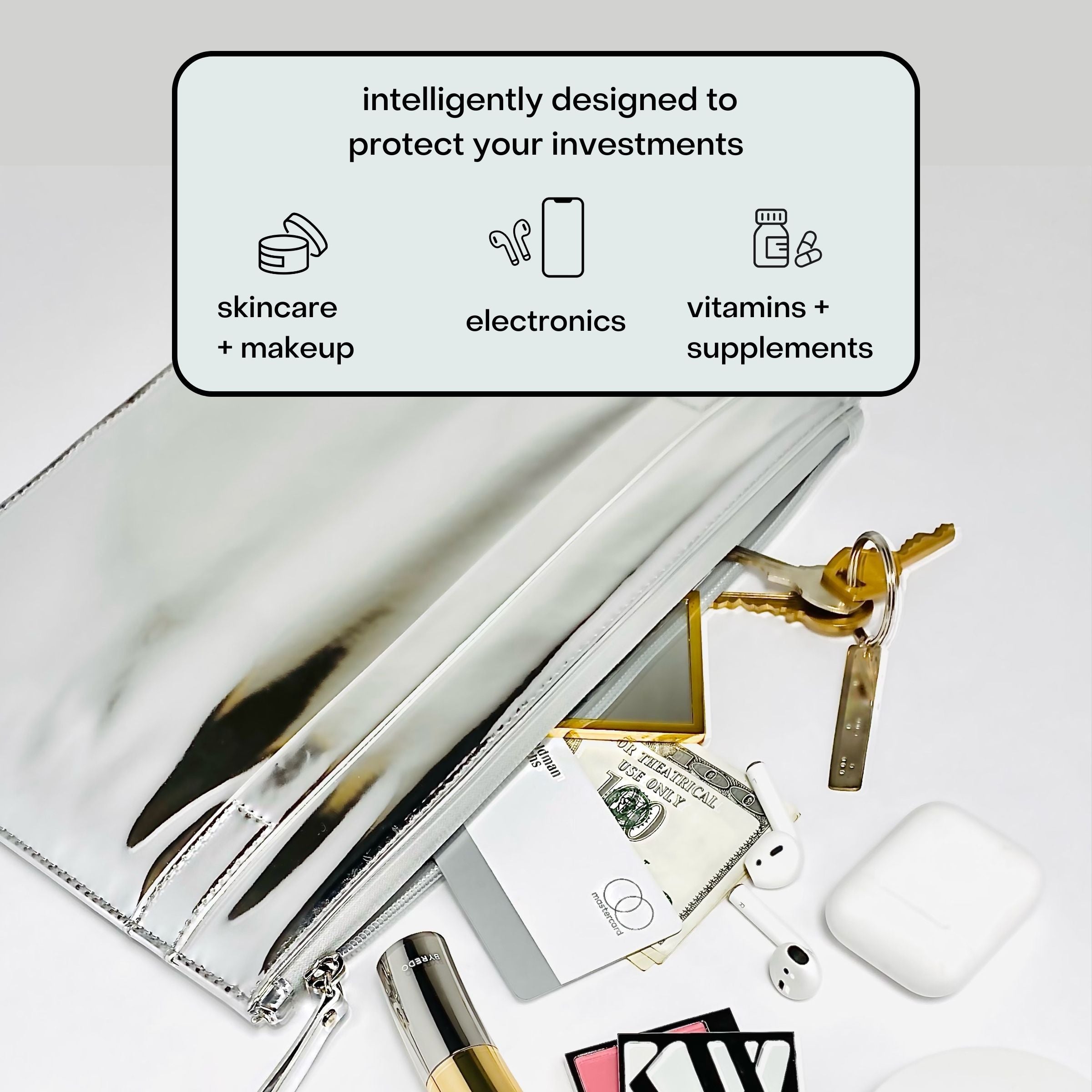 Intelligently designed to keep your makeup, vitamins and electronics organized and protected. Carry it as a clutch or slip it into your tote.